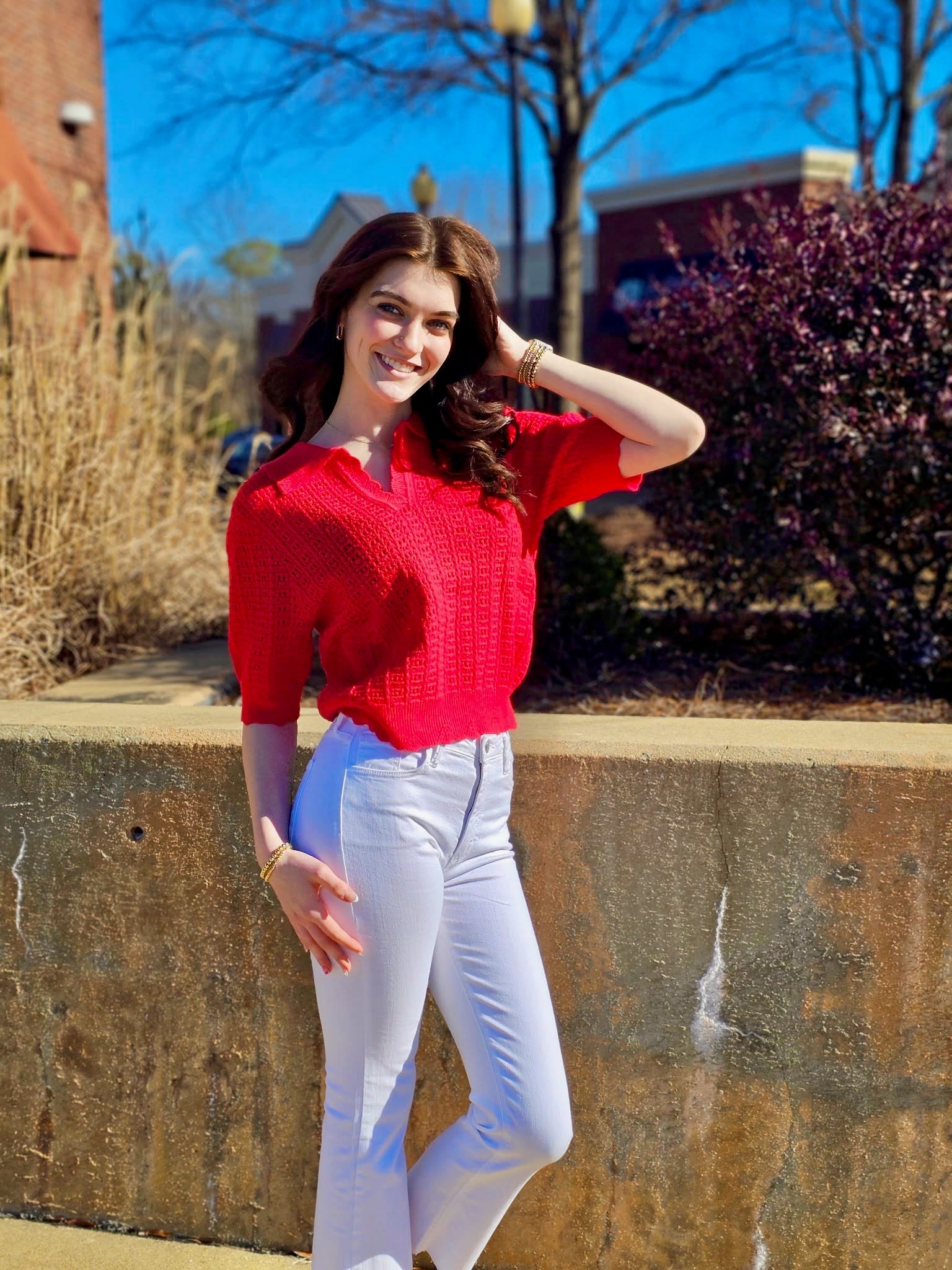 Stunning red top that adds a pop of color to any outfit. Perfect for both casual and dressy occasions. Comfortable fit and flattering silhouette make this a wardrobe essential.