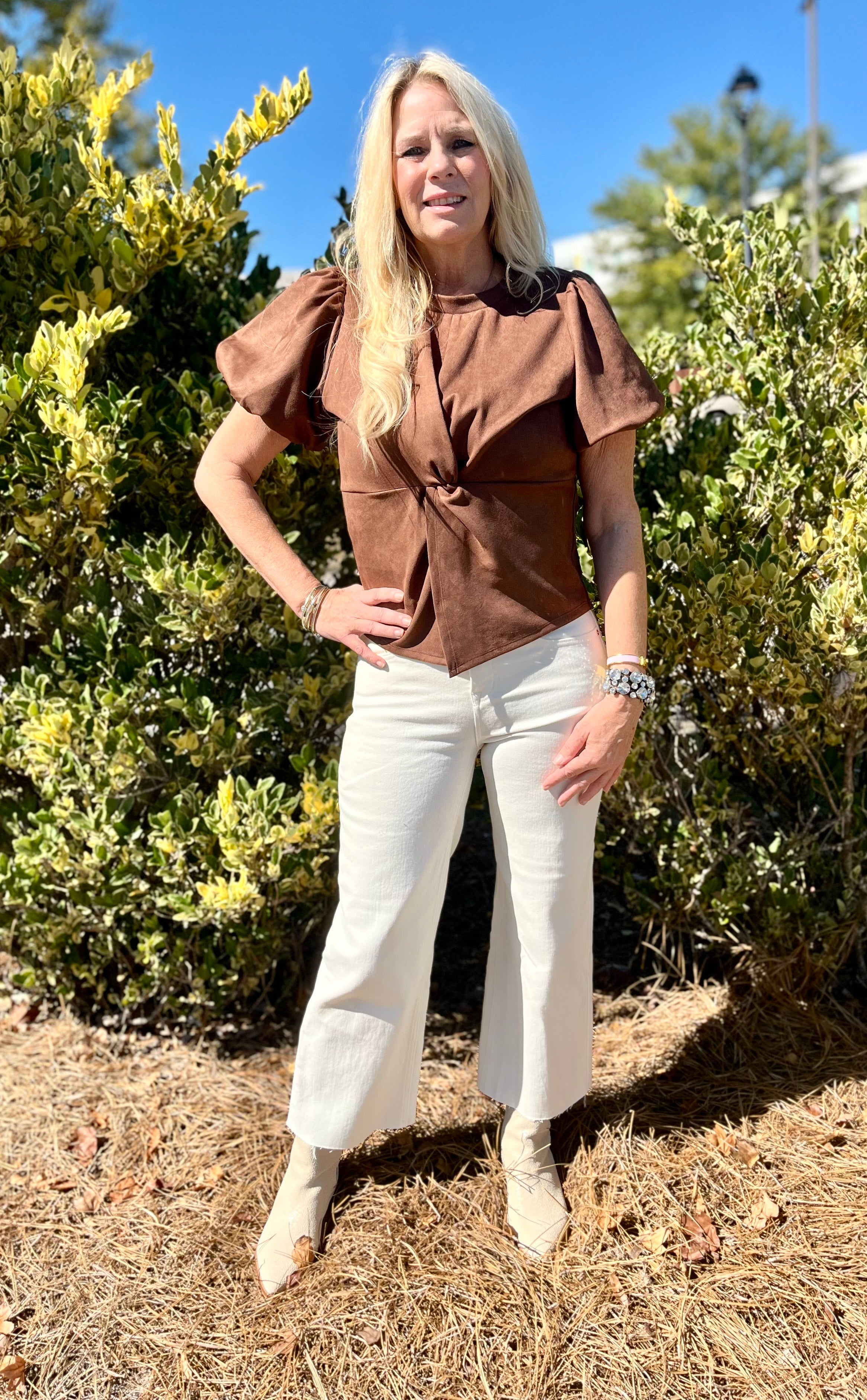 PUFF SLEEVES TWISTED DETAIL SUEDE TOP