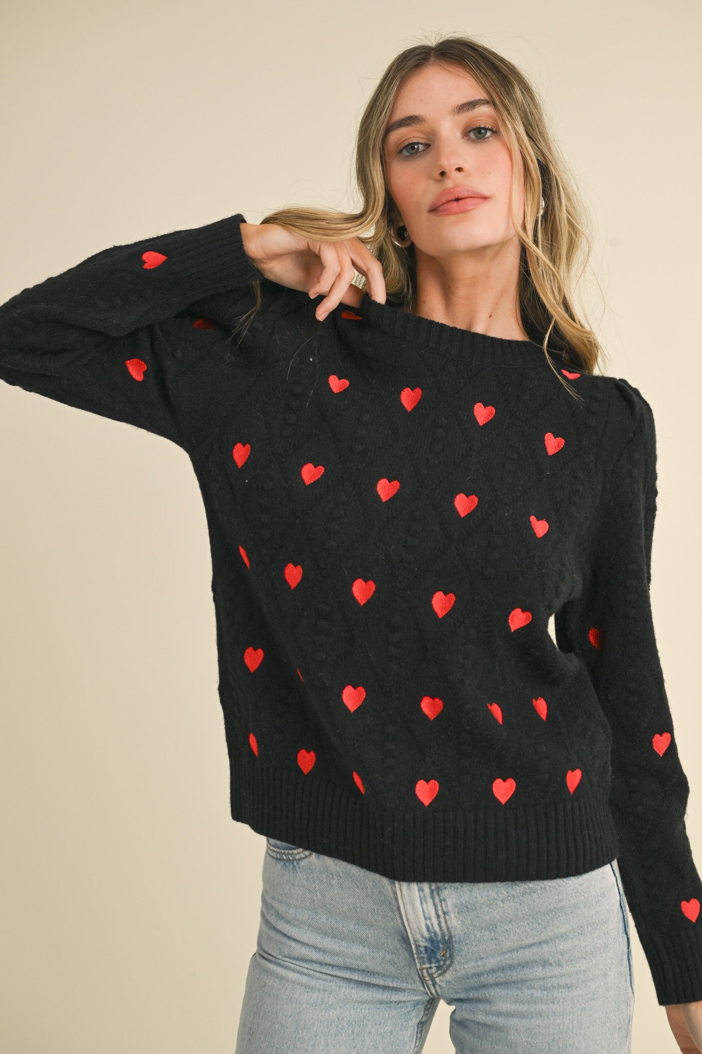 HEART ENBROIDERY POMPOM SWEATER RIBBED ROUND NECKLINE , GATHERED PUFF SHOULDERS .